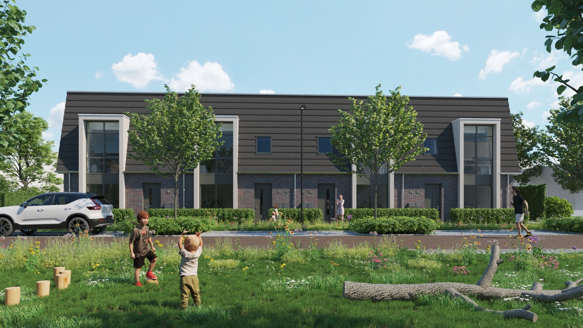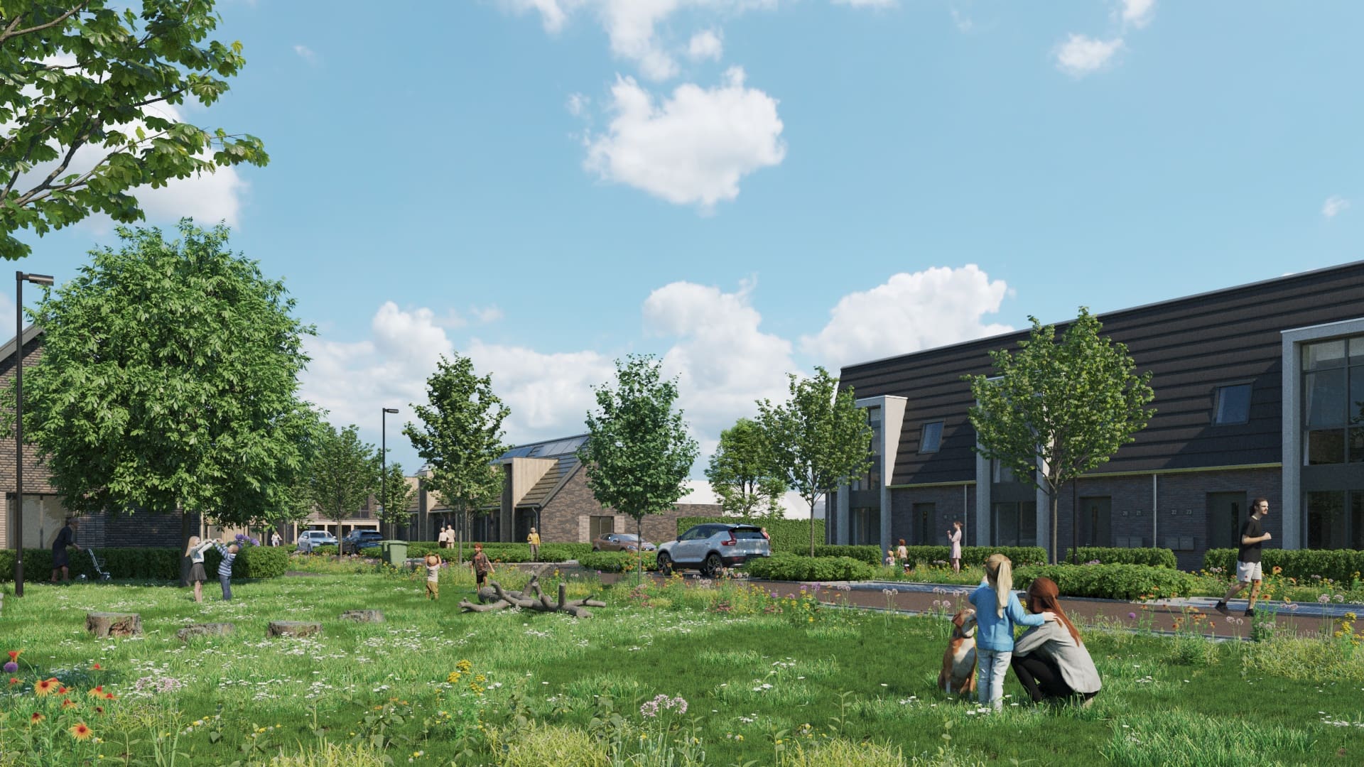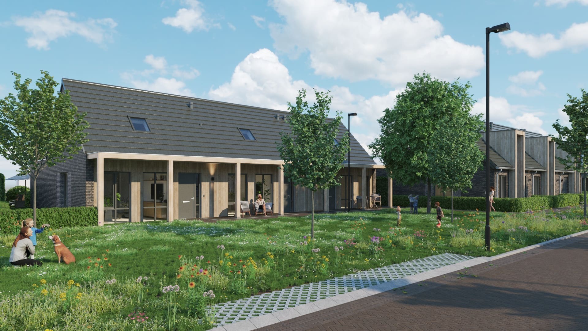 Een modern hofje met een warme, dorpse uitstraling. De woningen liggen rondom een groen binnengebied en sluiten aan op de bestaande wijk. Door de opzet met veel ruimte, groen en verschillende woningtypes ontstaat een sfeervolle, rustige woonomgeving voor verschillende levensfasen.